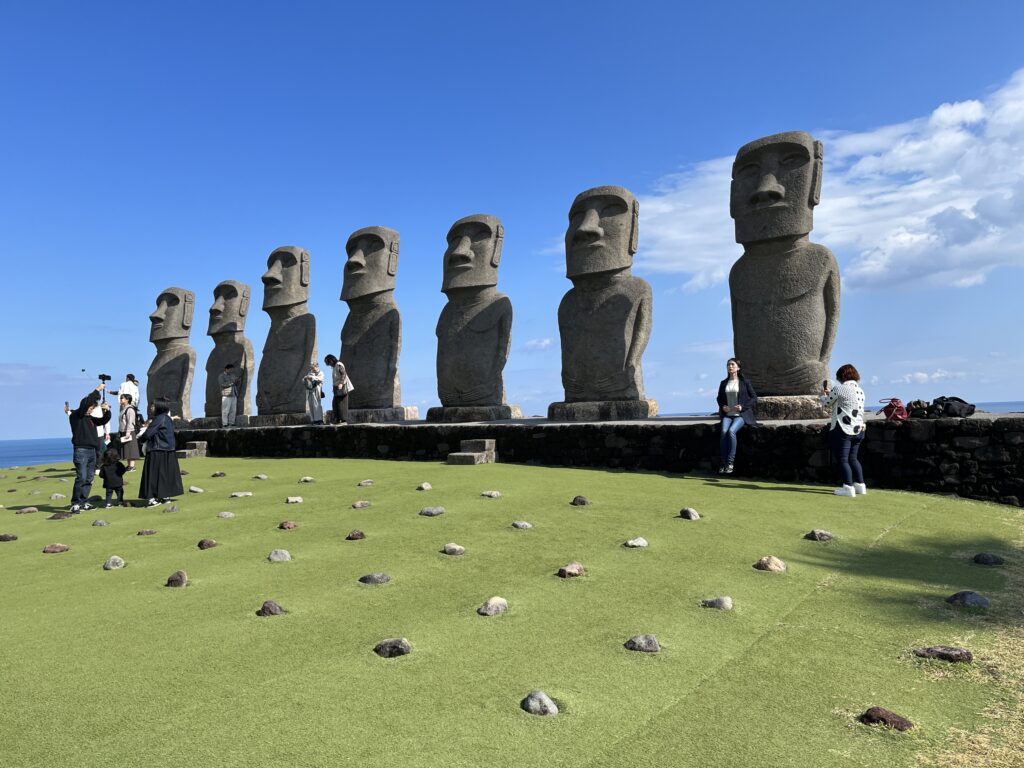 One of the most fun spots was a row of colorful, seated statues further up the hill. They reminded me of Rodin’s “The Thinker,” looking down over the Moai. Many tourists were sitting between them, mimicking the pose for photos—and of course, we couldn’t resist joining in! (Laughs)