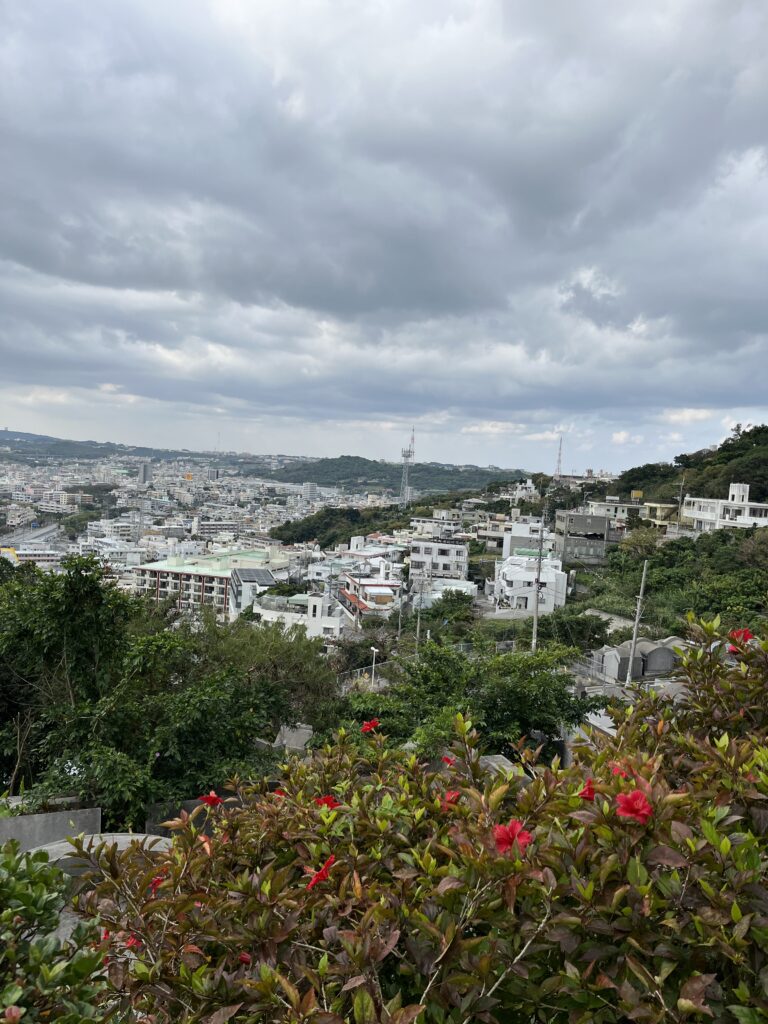 At the southern end of the garden, there is an observation point called Kanko-dai. Interestingly, despite being on an island, you cannot see the ocean from here—only rolling hills and the city of Naha.