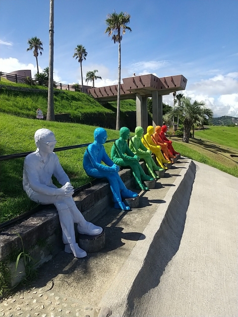 One of the most fun spots was a row of colorful, seated statues further up the hill. They reminded me of Rodin’s “The Thinker,” looking down over the Moai. Many tourists were sitting between them, mimicking the pose for photos—and of course, we couldn’t resist joining in! (Laughs)